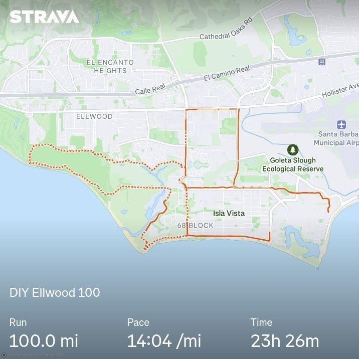 Loops 13 and 14 were a total blur. Just a mix of running 2 miles, hiking 1. Another pizza break was in order after loop 14. During loop 15, we had an interesting convo with a policeman. He inquired about our odd, 2am trek on the side of the road. At the end of loop 15 I was at 95 miles. For the last 5, I called an audible on the route. We ran along the roads in Isla Vista. At mile 99, I called Kerong saying we had one mile left and that she’d better get outside quick. I was eager to get done. I found some hidden energy and ran a 8 minute 100th mile. Long day.